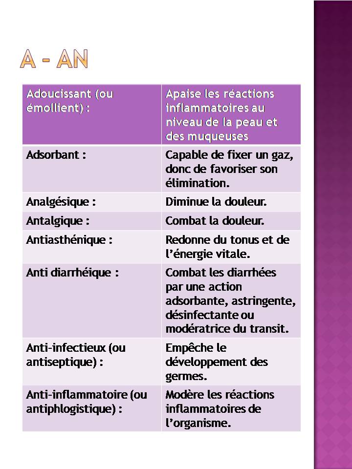 Antiphlogistique : médicament qui combat l’inflammation (bains, cataplasmes, émollients).