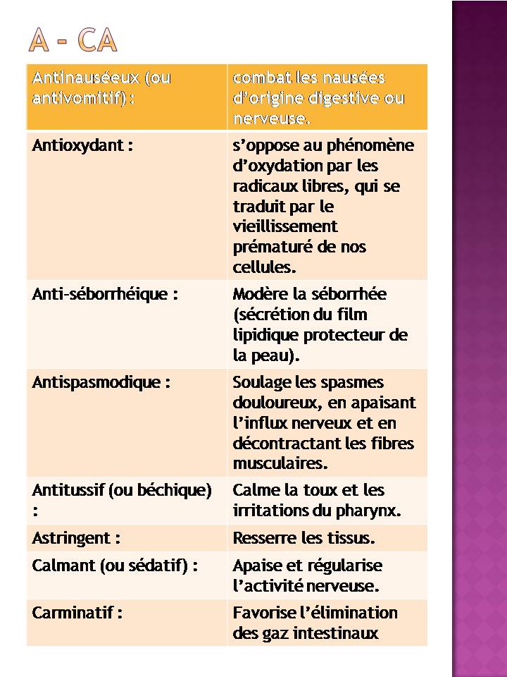 Astringent : qui resserre les tissus, modèle les sécrétions, cicatrise les plaies en prévenant l’inflammation (dans hémorragies, diarrhées, plaies, leucorrhées …)