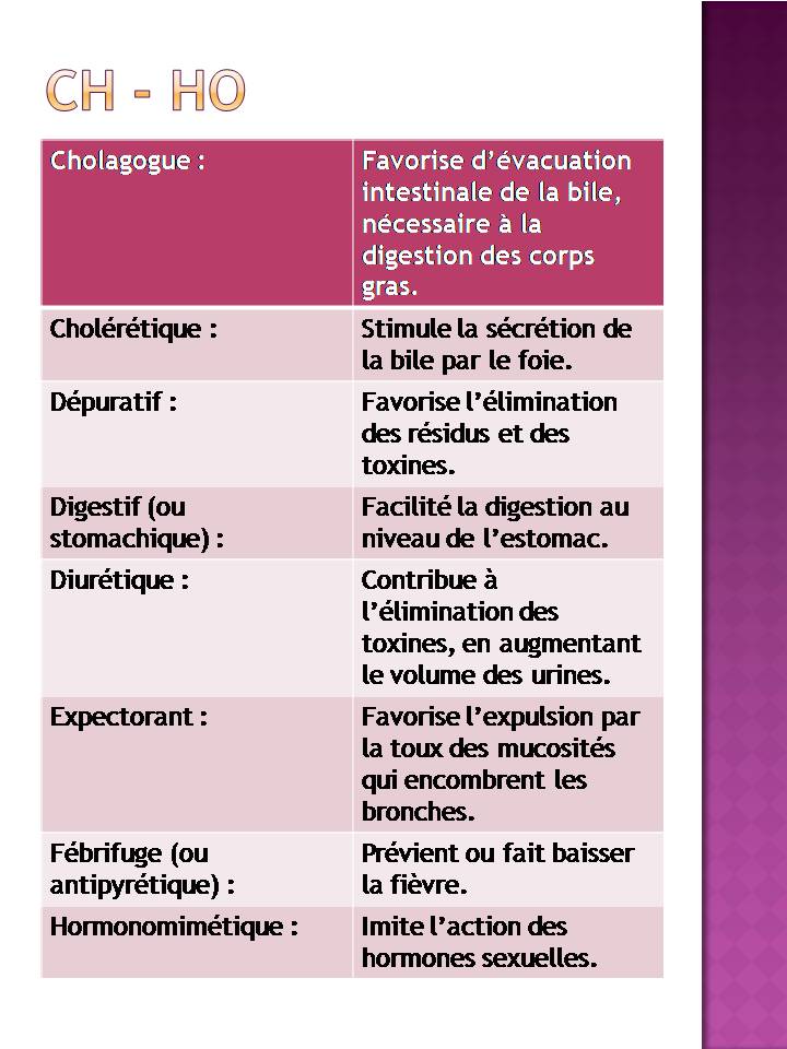 Chlolagogue : qui facilite l’évacuation de la bile des voies biliaires et surtout de la vésicule.